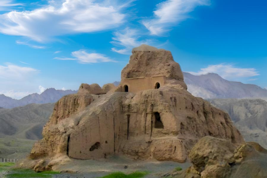 烏什喀特古城は“三重城”という意味です。新和県から西へ向こうで約20キロ離れるところにあります。漢の時代の遺跡です、漢の時代の亀茲国の大都市の一つだと言われていました。街は三重で、外街、内街、中心城が三つあります。外街はもうなくなったですが、内城は完璧で保存しました。東西は408メートルで、南北は451メートルです。残りした壁は高さと厚さも5メートルです。遺跡には“漢帰義羌長”という陰文起きない羊紐銅印章が一枚が発見しました。大変珍しいものです。