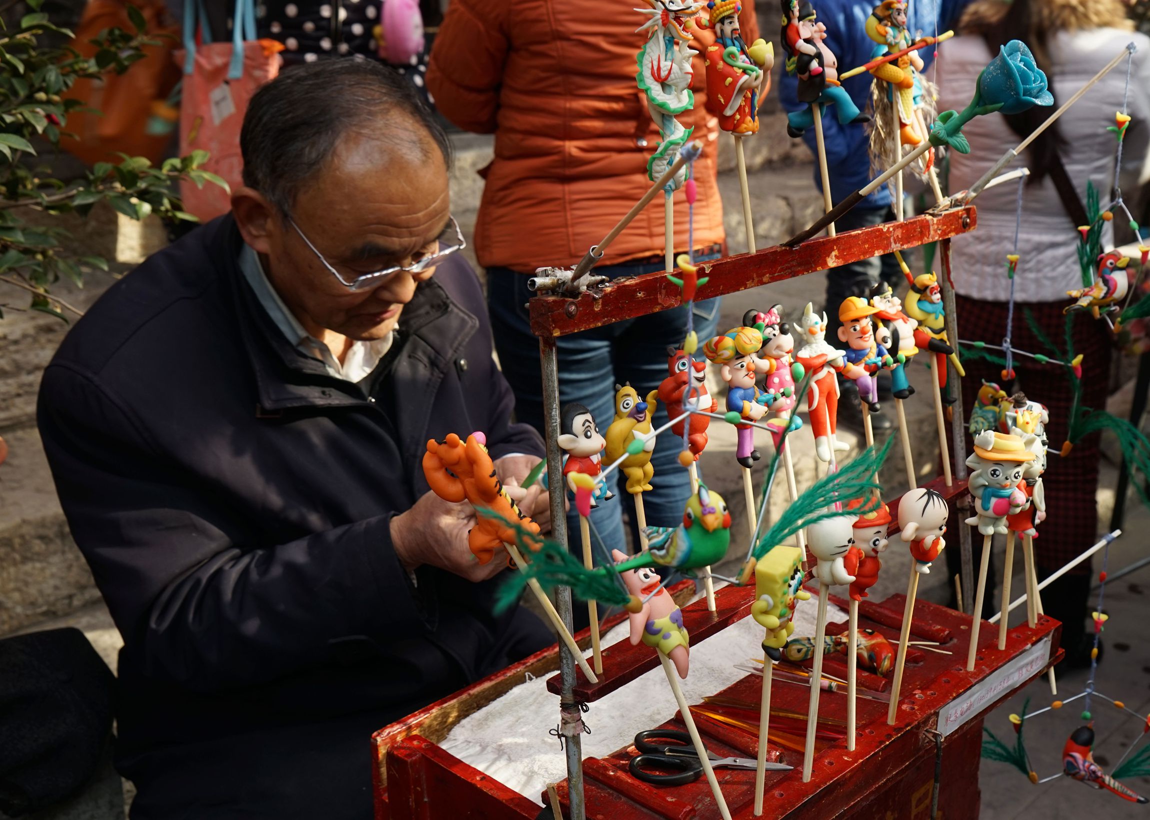 漢族の民間工芸品の一つで、作り方が簡単だが芸術性が高く、漢の時代にすでに文字で記されていた。左手で揉む、擦る、押すなどの工作をし、右手で竹のナイフを使い、巧みに描いたり、切ったり、刻んだりする。その後またアクセサリーを付け、衣装を着せたら完成です。こういうまるで生きているような人形は、北京の町を飾っており、北京の代表的なお土産になっています。