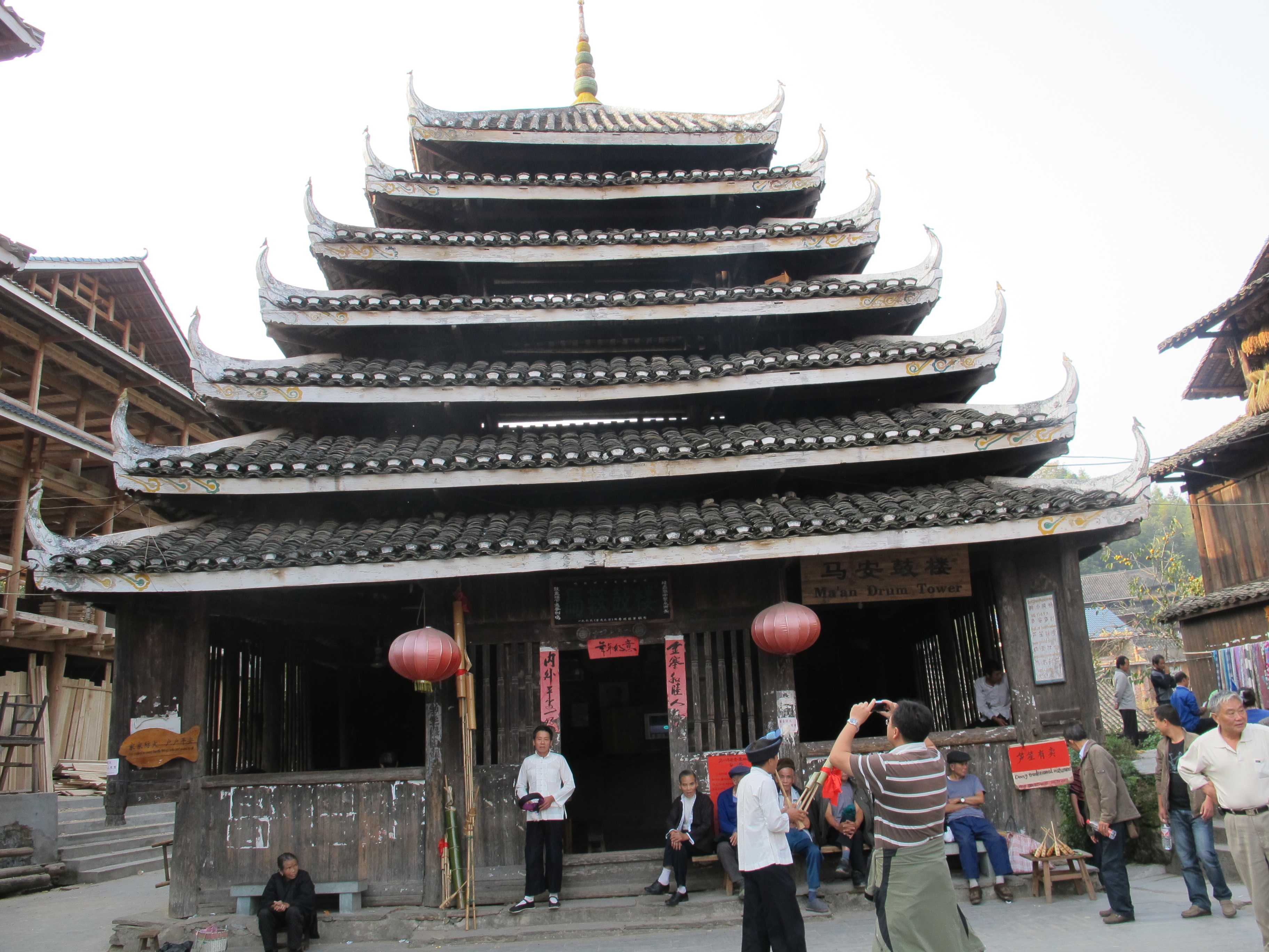 三、馬安寨にはトン族の特色のある鼓楼があります。鼓楼の中に上から大きい太鼓が一つぶら下がっています。鼓楼は普段、村の人々が娯楽と話をする憩い場所ですが、祭りの日と村の大事なことを相談するときに村人の集まる所になります。