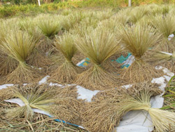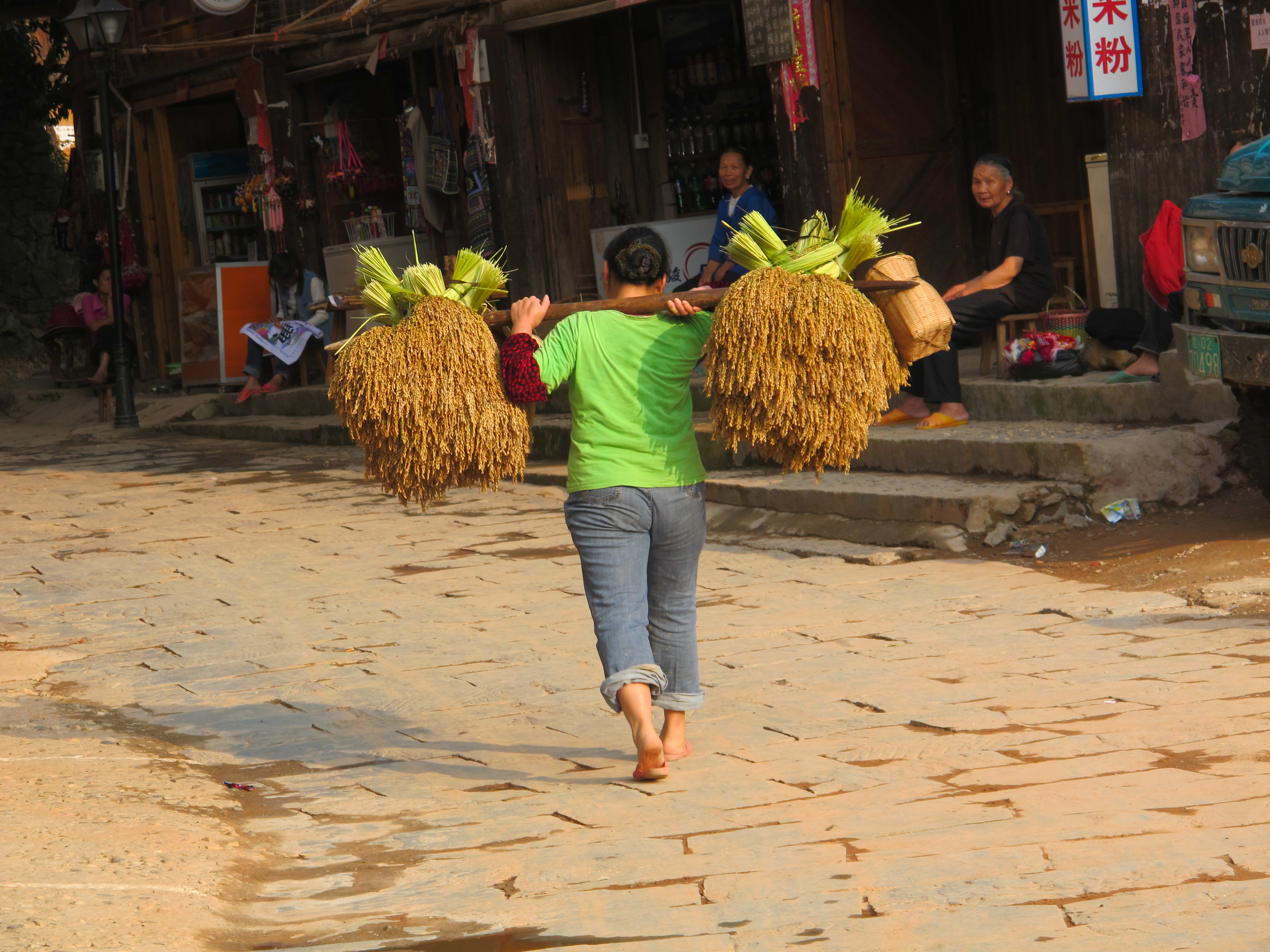 四、村を歩いていた時、稲の穂を担って家を帰る女性に出会いました。この所ではまだ昔から残ってきた風習を守っています。稲狩りをするとき、穂だけを刈って、残りの稲藁はいろいろな役割があるそうです。一つは藁を焼いて、その灰を水に浸かって、弱アルカリの入っている「灰水」を作ります。粽などの食物を作る時その「灰水」をちょっと入れたら、夏には冷蔵庫がなくても長く保存できるそうです。もう一つは布団のカバーとシーツなど汚れの取りにくいものを洗濯する場合、稲藁と一緒に煮た後、洗濯物はとてもきれいに洗えるそうです。