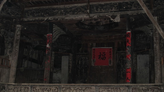 中に入ると、素晴らしい昔ままの木造の舞台が目の前に現れてきました。舞台の両側に「桟敷」があります。クラスの高い舞台です。舞台に人物や花と鳥などの木彫りがついて、地方の特色があります。文革大革命の時、このような文物はほとんど毀されました。このように完璧に保存された立派な舞台は珍しいです。このまま放っている状態で、いつかは壊れてしまうと惜しいことですね。