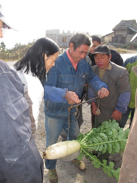 ここの豚肉も野菜もみんな緑食品ですよ。量った結果、この大根は何と4キロもあります。ほかに栗などもよく売りました。秦さんは喜んでいます。