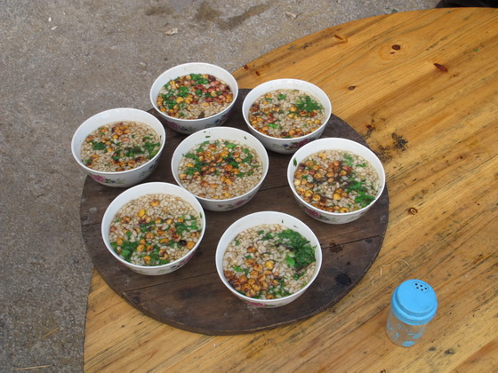 わーっ!飛んで行って参加したくなりますね。熱々の豚汁、それに激辛の香菜と葱を添えて、お行儀なぞ気にせず、立ち食いで胃袋に収めたいですね。写真の友人、各人おしゃべりなどありませんね。バグバグ、ズルズル相手を見据える暇もありません。至福の一時ともうしましょうか。「美味き物を眼前にしては、黙して語らず」。腹ずんと重くなったところで、椅子に座り、油茶をすする、ついつい饒舌がほとばしる。語りに夢中になりにし頃は、すでに帰桂の時刻、時間よ止まれ、しかし、しかしお別れの時「名残は尽きぬ」。此の夜の秦さんぐっすりと眠りに就かれたことでしょう。