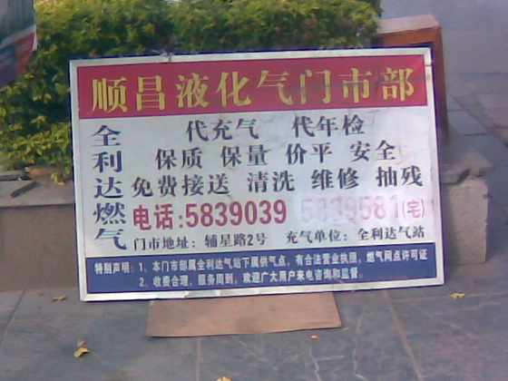 中国では、普通の家庭でよく使う燃料は「液化石油気LPG」または「液化天然気LNG」の二種類です。北方ではおおく液化石油気を使っているので、日常の会話は「液化気」と言い、南は液化天然気をよく使うので日常は「煤気」と言います。昔はほとんど「煤気罐」(ボンベガス)を使いましたが、現在は「管道煤気」(パイプガス)が普及しています。「煤気罐」と比べて、「管道煤気」の方が安くて、便利で、清潔などの利点があります。それによって、かつてお客さんが大勢来て賑やかだった「供気站」(ガスステーション)は静かになってきました。現在の「供気站」の数はだいぶ少なく、規模も小さいです。経営者は多く田舎から来る人で、コストを削減するため、オーナもスタッフも運搬夫もよく同じ人で、サービスは行き届いています。電話一本で全てサービスしてくれることは昔には思いにも寄らないことです。毎日、人力で30キロ重さのボンベを5、6階までも運ぶ苦労は普通の都会の人間が我慢できないのです。それでも、物価が暴騰するため、「煤気罐」を使用する人がだんだん少なくなって、経営は難しいです。いつも電子コンロを使う私はたまに「供気站」に電話をかけて「煤気」を送るように頼むと、向こうの声は大変嬉しそうに聞こえました。その瞬間の気持ちは言い難いです。