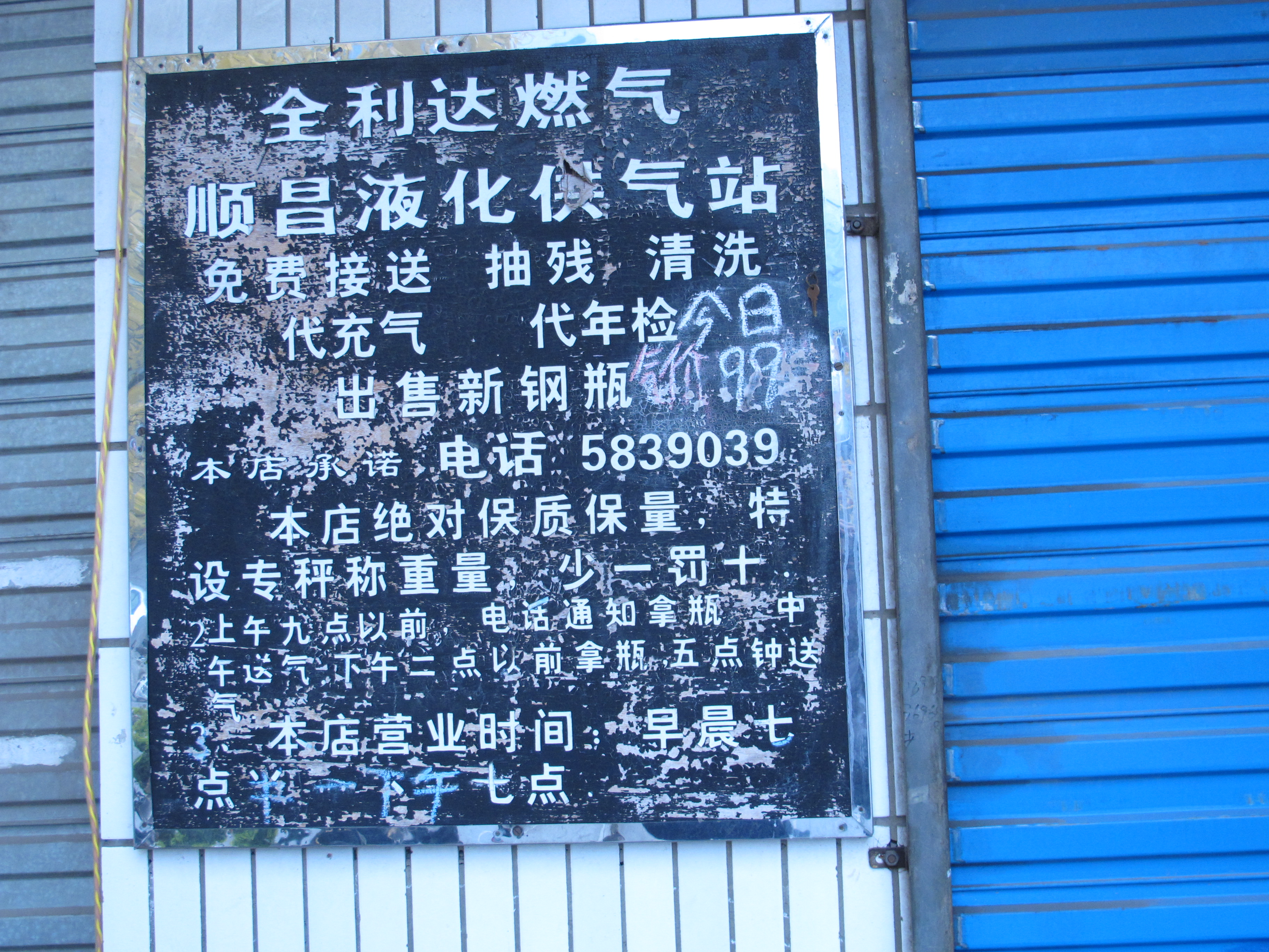 看板の上に「今日の値段は99元(ボンベ一本で)」と書いてあります。