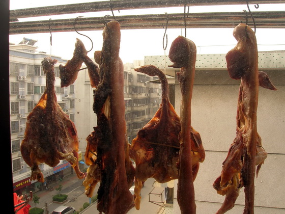 「冬至」の日になると、桂林の市民は前の日に片づけておいた鶏、家鴨、魚、豚肉を屋外に出して干します。
