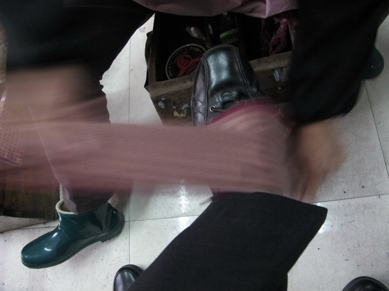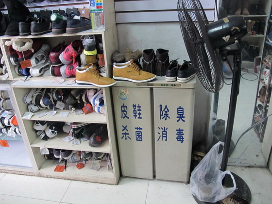 「擦靴店」は近所の「馬坪街」にあります。それほど大きい店ではありません。清潔で、よく片づけられた感じの店です。スタッフは全部で四人いました。その中の夫婦二人は店のオーナです。店が開けっ放しになっているので、寒かったです。靴磨きのほか、靴の修理、除臭などのサービスもするのです。
