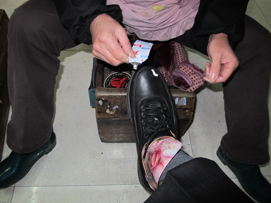先日雨が降った時、泥水に汚れた靴はずっとそのまま磨いていない状態です。今日は雨が晴れてきたから、「擦靴店」(靴磨き店)へ靴を磨きに行きました。近年「擦靴店」へ行くことは少なくなりました。ガイドの仕事をしていた時はよく行きました。空港へお客さんを出迎えに行く前にいつも「擦靴店」へ行って、靴をピカピカ光るまで磨いてもらうようにしました。目を瞑って、靴を履いたままでサービスを受けながらツアーのスケジュールと注意事項などを考えるのは仕事を始まる前の前奏曲になりました。靴を磨くことによって、仕事が始まる前の緊張感を安らかにすることができました。空港へお客さんを出迎えに行く前にマッサージや美容などをすることによって、緊張感を緩和するガイドもいたそうです。ガイドの仕事を止めた後、ほとんど自分で靴を磨くようになりました。今日はせっかくだから、靴を四足持って、近くの靴磨きの店に行きました。