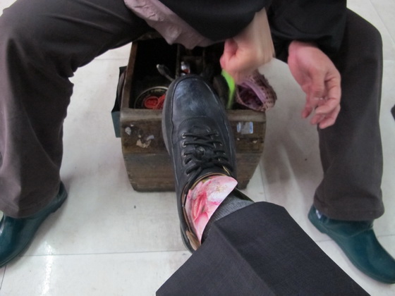 確か、中国では路上の靴磨き代が5元くらいですよね。日本では500円以上は取られるから、信じられないくらい安いですね。日本では年々靴磨きが減って、今では探してもなかなか見つかりません。靴自体が消耗品の時代になって、履き捨にしてしまい磨かなくなったのも一因ですね。それでも靴を磨いた後の晴れがましい気持ち、時々は味わいたいですね。 私は何と言っても、中国の盲人按摩が好きで、はまっています。日本の料金の十分の一以下で、たっぷり一時間揉み解してくれます。中国に行ってホテルに荷物を置くと、さっそく街へ出て盲人按摩の看板を探します。ただ、私の中国語はジェスチャーを交えないと伝わらないレベルです。相手は盲人・・・いつも苦労しています。
