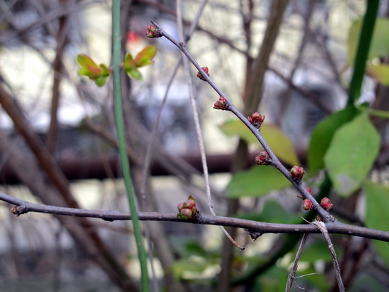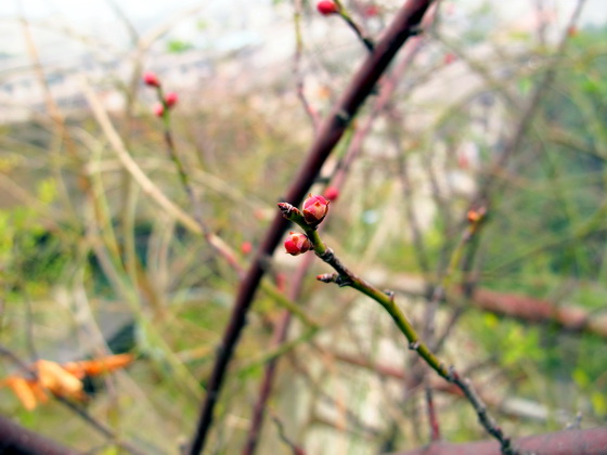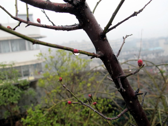 雨水の節気が過ぎると、天気が暖かくなりました。風が顔に当っても寒くなりません。耳も凍える感じがなくなりました。朝、屋上ガーデンに上がると、あれ、紅梅は小さい蕾が出たのではないかと驚きも喜びもしました。それから、隣の木海棠と黄梅も静かに蕾が膨らんでいました。春が来ました。春は私たちが知らないないうちに近寄っててきました。