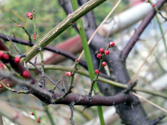 屋上ガーデンの紅梅は蕾が出ました。桂林ではもう春の息吹が感じていました。