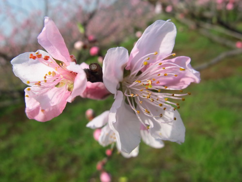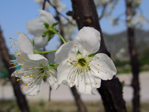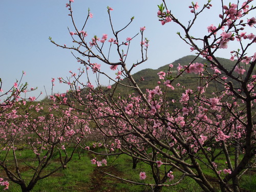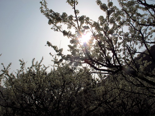 朝八時半ごろ、私たちは桂林市区を出発しました。市街区を出て、三十分経って、大墟鎮に着き、九時半ごろ、潮田郷を通りました。途中は車は少なく、人の姿もほとんど見えませんでした。潮田郷を抜けて、大鏡郷に入りました。車の右側には思安江(灕江の支流)が流れていました。川の両岸の木は黄ばんだ新緑が元気よく伸びて、活力が満ち溢れていました。野原にはあちこち赤とピンクと白などの花が咲いていました。道端の野菜畑に青くてつやつやした韮、黄色い花が咲いている菜花と白い花が咲いている大根などとても綺麗でした。突然、前方に一面雪のような真っ白な花が咲いていました。それを見て、みんなは言い合わせた様に叫びました。近づいて見るとそれは果樹園の李が咲いている花だと分りました。みんなは車を降りて、写真を撮りに行きました。純潔な花がほのかな香りを漂わせていて、そのような花の中にいると思わずその美しい景色に見蕩れてしまいました。土と草と花の匂いを混ぜた朝の空気を吸いながら、下は湿潤な柔らかい土を踏んで上は美しい花を楽しむというような気持は実に爽やかで、忘れ難いです。