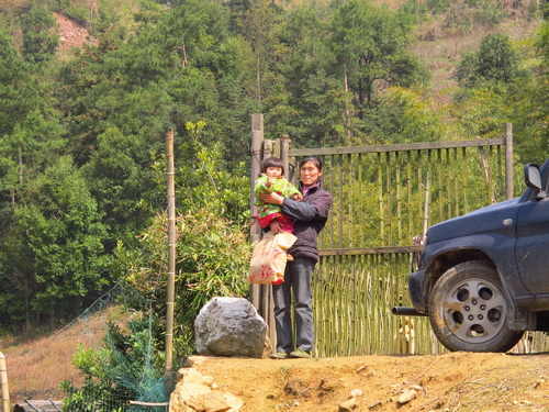 今度お邪魔した村の人の名前は廖さんです。来る途中道を作っている廖さんに出会いました。孫娘を抱いた奥さんが私たちを迎えてくれました。子供さんはキノコ狩りに行く私たちにさよならのポーズを出していました