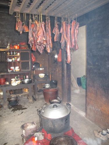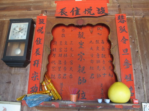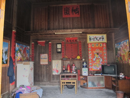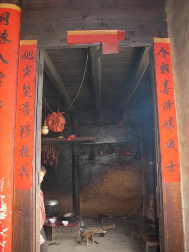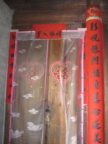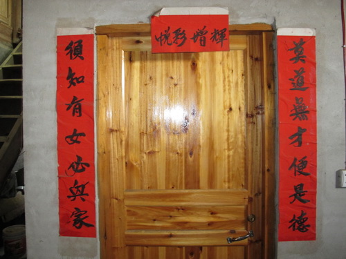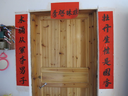 廖さんのご夫妻の家です。門の上にまだ三年前結婚した時の「喜」の字が残っています。赤い対連には娘さんが生まれたことをお祝いする内容を書いています。中国の歴史上(宋時代)の有名な女の将軍「花木蘭」という女になるように出世すると祈っています。