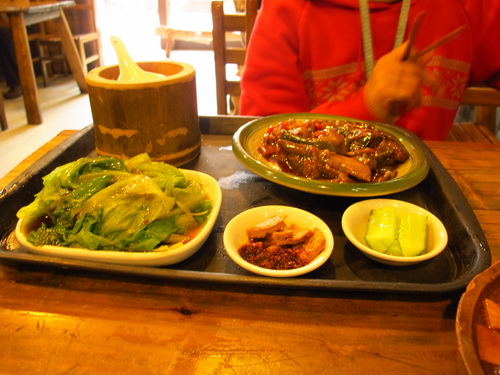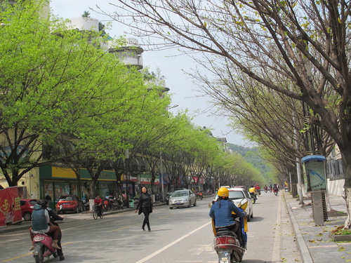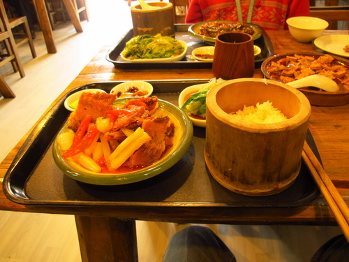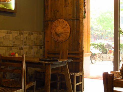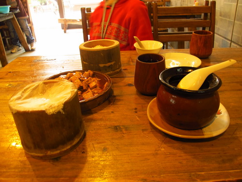 清明節の後、桂林ではよく雨が降りました。今日は晴れてきました。気温も24℃まで上がりました。道路の旅側の並木は新緑が芽生えて、日差しのもとでとても綺麗に見えました。お昼はいつも自炊しますが、せっかくのいい天気なので、怠けて外で食べるようにしました。すると娘と二人で近所の「馬坪街」にある「栄養厨房」へ行きました。「栄養厨房」はそれほど大き店ではありませんが、特色のある中華式のレストランです。お客さんはカップルが多かったです。店は長閑な家庭の雰囲気に溢れていました。テーブルは丸太で作られています。コップは普通のレストランのグラスと違って、木で作ったのです。ご飯を入れる食器は竹の筒をそのまま切ってできたのです。これは気に入りました。お茶は決明子のお茶で、チョコレートか麦茶みたいな匂いがしました。私の好きな匂いです。この店の最も有名なのは大きなかめで蒸したスープです。メニューは大抵普通な家庭料理で、値段はほどほどです。二人でそれそれ、茄子とぎんだらのセットメニュー、椎茸と家鴨のスープと干し豆腐を注文しました。合わせて60元しかかからなくて、得でした。食器を洗わずに良かったです。