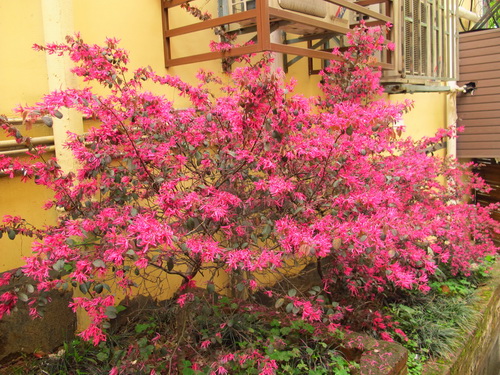店を出た時、花壇の中の奇麗に咲いている常盤満作の花は人に長閑なイメージを与えました。ピンク色の常盤満作の花は店のムードに似合うと思ったので、カメラに納めました。