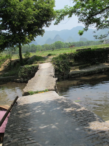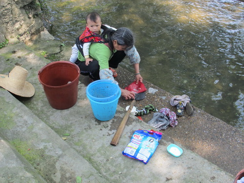 村の近くを流れ通るこの川の名前は護龍河といい、灕江の支流です。 お婆さんが孫を背負って洗濯する場面を見て、懐かしかったです。中学校の時、家族全員の洋服を洗濯するのは毎日の日課でした。