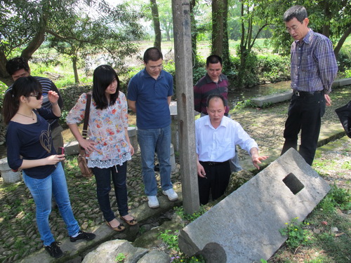 この石橋はもう五、六百年の歴史があります。真ん中の所はよく歩いたのでつるつるしています。橋の向こうには筆置きの山」と「印鑑山」がつながっているので江頭村から出た官吏はほとんど文官だったそうです。
