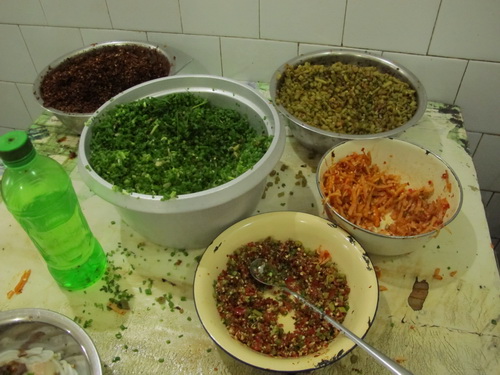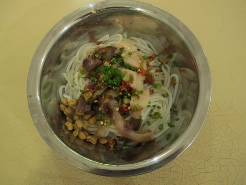 朝食の時、人が多くて、忙しいので、普通は先払いで食べるのです。値段は一碗で3.5元です(一碗の量は2両で、約100グラムです)。ビーフンは既製品で、笊の中に入れて温めた後、鍋焼、チャーシュー、牛肉などのトッピンを入れてからすぐ食べられるようになります。もし、唐辛子、葱、香菜、酸菜(インゲン豆、筍、白菜などの漬物)をお好みで入れて食べるとさらに美味しくなります。
