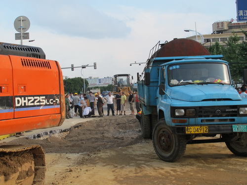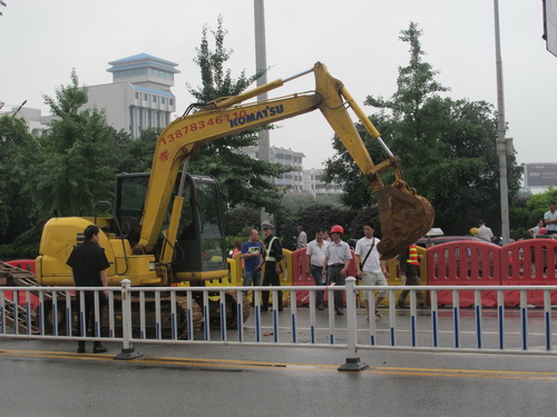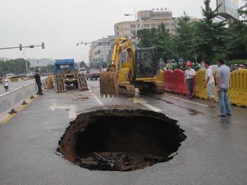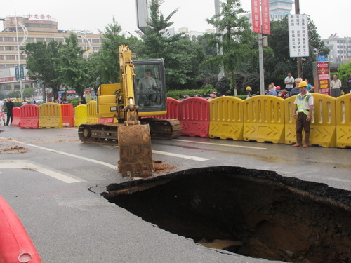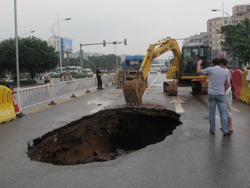 六月になると桂林は雨期に入りました。夜、大雨が降り、翌日の朝、腫れてきます。昼間には太陽が出ると、気温が上がり、蒸し暑くなります。昨夜、桂林では雷雨が降り、夜明けの時、雨が上がりました。よく雨が降った原因でしょうか、今朝五時ごろ、「甲天下」広場の信号機の近くで陥没があって、大きな穴が開きました。あいにくとそこを走り通る一台のワゴン車がその穴に落ちました。