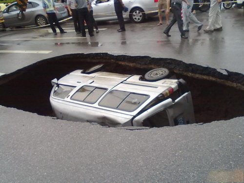桂林甲天下広場の道路で陥没ですか、やはり桂林はカルスト台地の上に漓江が流れていますから、どうしても大水出たりすれば、どこかしら浸食を受けて道路陥没を起こしかねませんね! 日本でも、時たま道路の陥没が起こり、ニュースになることがあります、何処も同じような事が起これば野次馬も登場しますね。 運転手大丈夫でしたかね、車の損害もそれ相当なんでしょね。