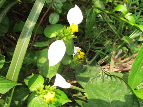 山の道端に初めてこのような名も知らない花を見ました。緑の葉っぱと黄色い花がありましたが、白いのは一体花なのかそれとも葉っぱなのかよく分りませんでした。