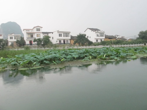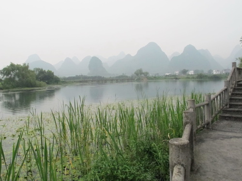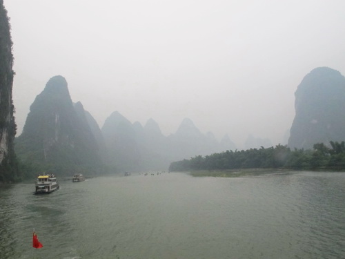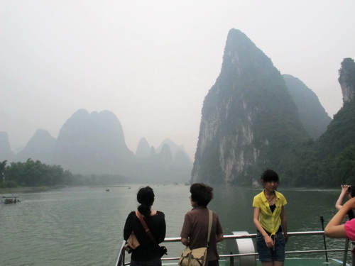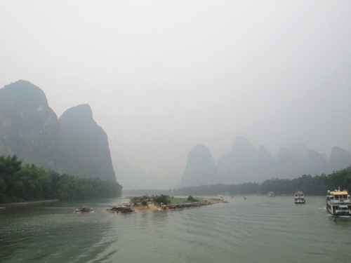 朝の9時、川下りの遊覧船は「竹江」船着場から出航しました。雨も降らないし、暑くもありませんし、天気が恵まれていました。靄がかかっていましたが、更に水墨画の雰囲気が添えられました。満水期なので、12時半頃、もう終点の陽朔県に着きました 。