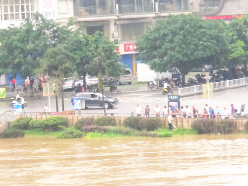 桂林は長雨が続き、室内の湿度もかなり上がり、体中不快感があり、日に、2度、3度とシャワーを浴びなければならないと、桂林の大学に留学中の日本人が嘆息をこぼしています。解放橋の上から写した、川の上流方向、左側に伏波山、右に桂林帝苑酒店が見え、かなりの水かさが増えていますね。下流方向に、左側、7星公園、右奥に微かに象鼻山、混濁したが水がごうごうと流れている様子がうかがえます。30系統、31系統のバス乗ると「微笑堂」の交差点から、解放橋に向かいますねー。右側が下流方向、日本の精密機械メーカー、「キャノン」の看板が目に飛び込んできます。1年前、毎日見慣れた光景でした。バスで師範大学まで通学していました。これだけの水が「珠江」に流れ込み、東莞の虎門に至ることを考えると漓江は、広西、広東の水運を発展させて、流域の土地を潤して豊かな実りをもたらしてくれるのですね。それにしても、水がなければ「旱魃」、多すぎれば「豪雨」、自然のもたらす所作は人間どもがかなうものではありませんね。早く、水が引いて、とうとうとした清流に戻ってもらいたいですね。「シェラトンホテル」前の木々の下で、悠久の漓江の流れを望みながら、読書に専念いたしたいものです。リヤカーに果物を積んで販売する物売りの声聞きながら・・・・・。