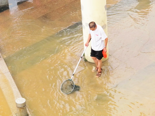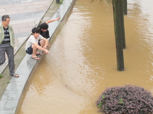 「小東江」の水が溢れられ、七星公園の子供の遊覧センターが洪水に浸かられて、入り口に「立ち入り禁止」の立札が立てられていました。