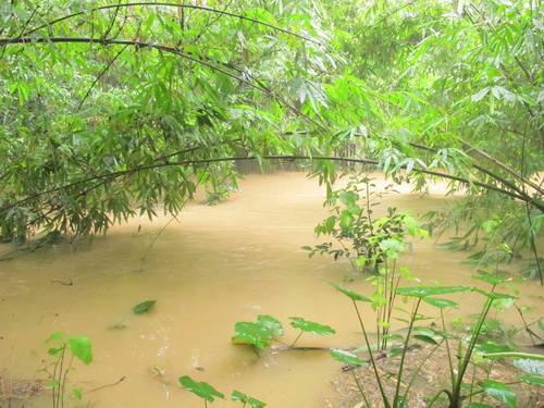 中洲の木が水に浸かられ、梢しか見えませんでした。遠い向こうの山は伏波山です。