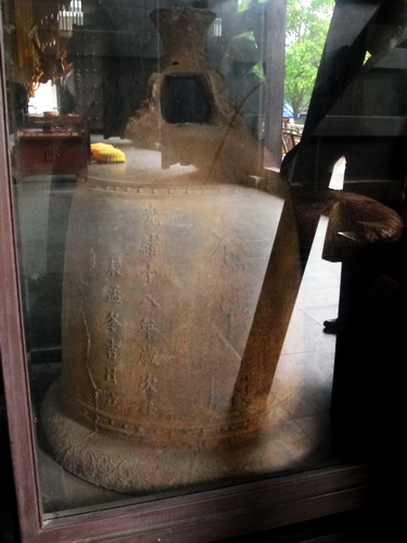 鉄鐘の上からかすかに棲霞寺 光緒十八年歳次辰孟冬吉日」名護の字が読めます1945年月日軍の大砲に砲撃されて「棲霞寺」は廃墟になりました。この鉄鐘は当時から残されてきたものです。