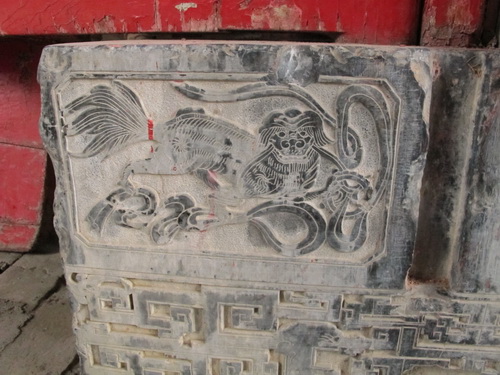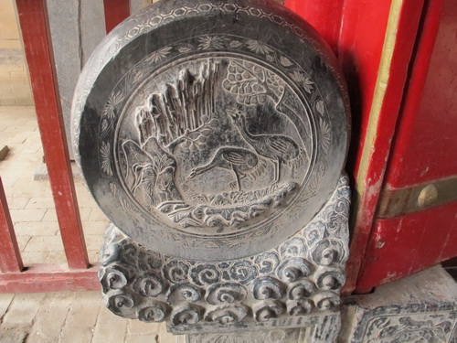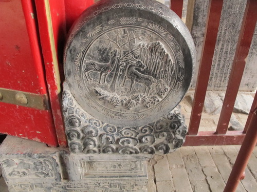 玄関の両側に鹿と鶴の石彫りがあります。