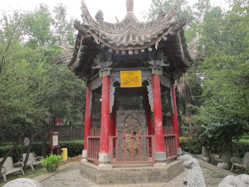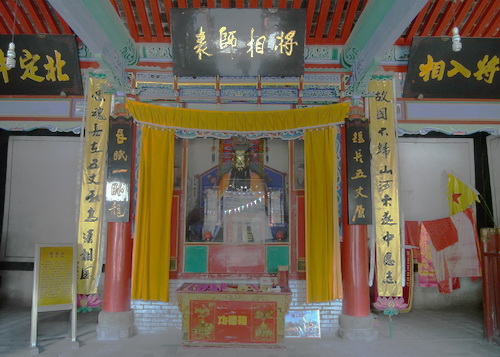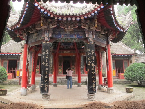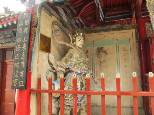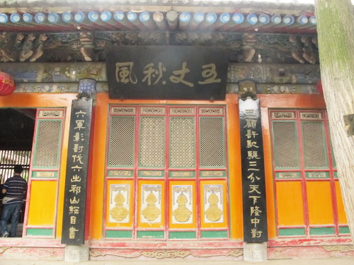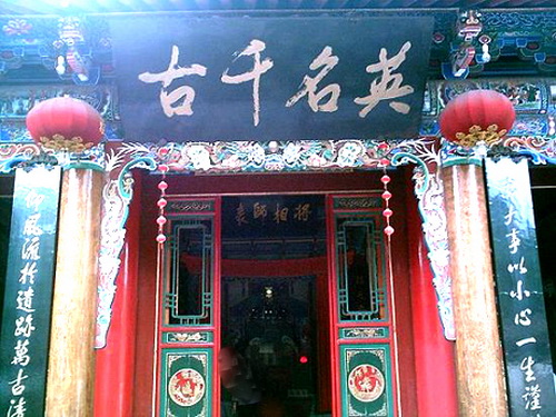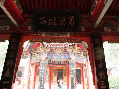 祭殿は元の「至元」初年に建てられています。軒下に「五丈秋風」と書いた横額が飾られています。両側の柱に飾られた「三顧許馳駆、三分天下隆中対、六軍彰討伐、六出岐山綱目書」という対聯は諸葛亮の一生のことをよくまとめました。