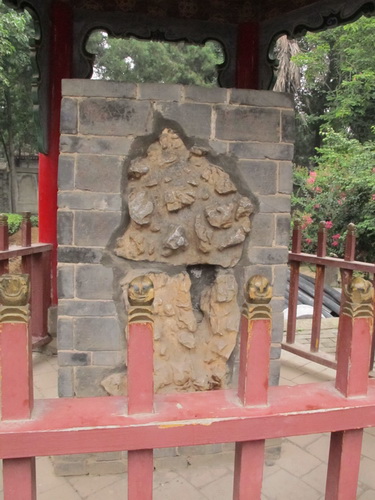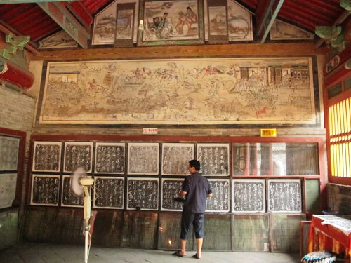 東西両側の壁の上方には「三国志」の物語の絵が描かれています。下方の壁に宋代の民族英雄岳飛の書いた諸葛亮の前、後「出師表」の石碑がはめ込まれています。石碑は清代の中国の北西部の大変有名な彫刻家の樊登雲が彫ったものです。この石碑は諸葛亮廟の「三絶碑」と言われています。