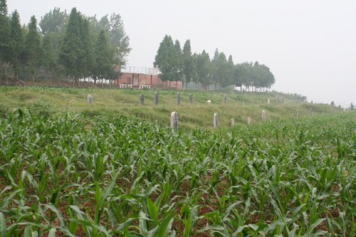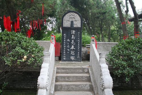 「 諸葛亮衣冠塚」は正殿の西南側の松柏の林にあります。諸葛亮が亡くなった後、蜀軍はひっそりに諸葛亮の遺体を「漢中」まで運んで、勉県の定軍山の麓に埋めましたが、記念のために「五丈原」で諸葛亮の衣冠塚を作りました。お墓の周りに石垣が建てられ、劉備を28年輔佐するのを象徴する28本の柱が建てられています。