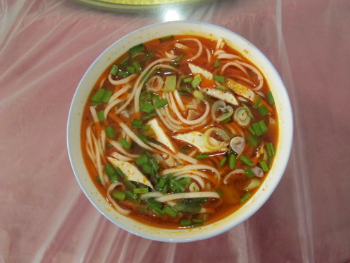 お昼は公園のすぐ近くのレストランで「臊子面」を食べました。臊子面」は宝鶏市岐山県の名物です。結婚式とお葬式、老人の誕生日と赤ちゃんの満月を祝うと伝統な祭りなどの日には地元の人はみんなこれを食べます。普通はスープを飲まないことですが、知らないで飲んでしまいました。鹹かったです。