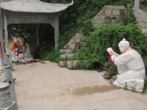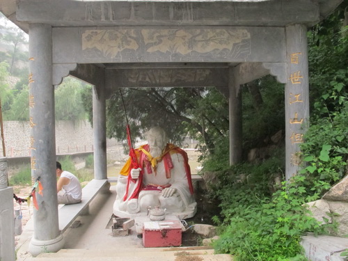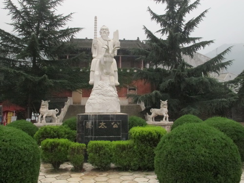 漢白玉で作った 姜太公は右手に「打神鞭」と、左手に本をもっています。後ろの建物は「姜太公廟」です。