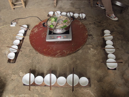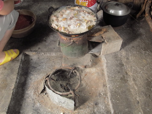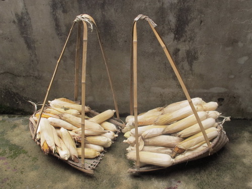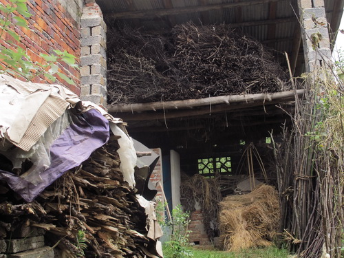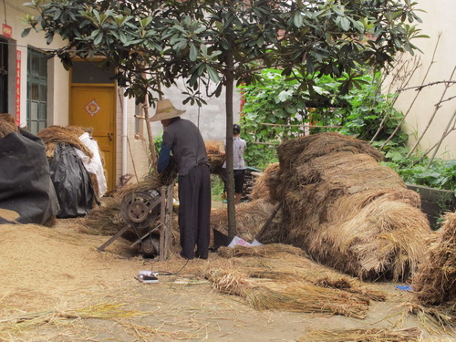 暑い中、桂林の山懐「灌陽県」への小旅行楽しかったでしょうね。同じ職場の唐さんの実家だとか。桂林から150km~200kmは離れているのでしょうか。大嶺山を越えれば湖南省。桂林天元旅行社の12名の方が、黒塗りの高級車で、田舎に入りこんでいる写真見ると、日本で1960年代のことが思い出されます。耕運機はジィゼル発動機を動力源に積み、長い柄の部分の手元のクラッチで方向転換を切り、大きく回るときは、左右どちらかの手を目いっぱい伸ばして操作、あまりスピード出してると慣性の法則で転倒いたします。危険極まりない「鉄馬」。これがまだ現代中国のいたるところで活躍している、また、手漕ぎ脱穀機(足踏み)、これも稲穂を乾燥させた後、両手で稲藁をつかみ穂先の実を脱穀機の回転部(ドラム)に三角に溶接された丸棒突起部に当てて稲穂の実を落とすいたって原始的脱穀機、足踏みしながら「グーン、グーン」と加速がついたら、両手でつかんだ稲を上下に回転させながら脱穀する、これまたかって日本の農村部で見られた光景です。土間で食事する習慣は、農家の人は忙しいから靴を脱いで座敷に上がり食事する煩わしさを避けるために、地下足袋、雨靴のままで、すきっ腹を満たすために土間で食事する習慣が根付いたのでしょうね。土間の「裸電球」、「土間の壁にかけられた鍋」、「簡易竈」(コークスか練炭)、そこに、ちよこんと電磁調理器が置かれ、その周りで鍋料理をつつく、一家団欒の至福の一時を過ごす農家の姿が垣間見れますね。また、燃料費を浮かすための「焚物小屋」、山から小枝、倒木を集めて小屋にプールして、お風呂の熱源、煮炊きの熱源にすべく小屋に積んで置く、此れもまた、農家の知恵です。ガス、電気量を節約するうえでもひつようですね。家の周りに、主食は言うまでもなく、副食物の「李」、「梨」、「トウモロコシ」、「クワイ」、「サトイモ」など、お金を出してまで買う必要のない生活食材を得るべく、植えてあるのですね。収穫された「収穫竹籠」を担う、陸さんの姿バランスがよくて、思わずにっこりせずにはおられません。この作業は素人にはできません。利き手で天秤棒を握り、立ち上がるとき、足を踏み出す時、均衡を保たたないと、前後に吊した籠がひっくり返ります。「よぃしょ」と、自分に言い聞かせるように、担ぎあげねばなりません。あとは、天秤棒をしならせて、その反動を利用して荷うので