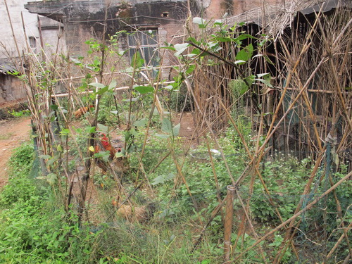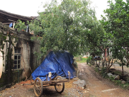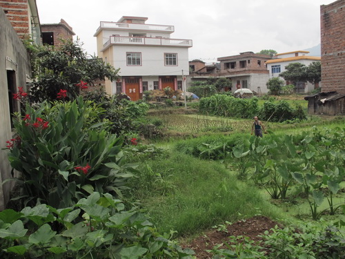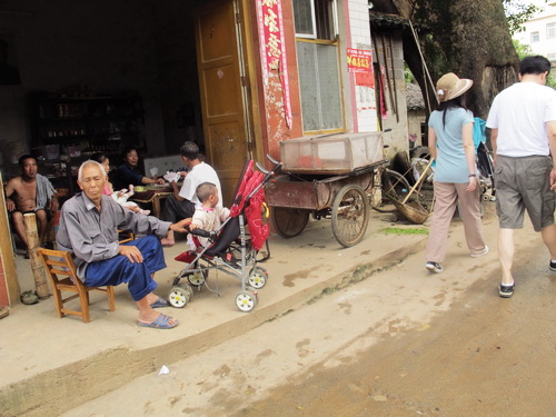 11:40頃、唐さんの家の所在地の「永冨村」に到着しました。車を村役所に停めてから、私たちは歩いて唐さんの家へ行きました。村の出入口に大きな楠木が一本あります。大木の下に売店があります。店の人がのんびりに喋ったり、「字牌」をやったりしていました。私たちを見ると友好的に挨拶をしてくれました。唐さんのご主人の話によるとこの村の人の祖先は湖南省から引越して来たそうです。村には老人と子どもが多かったです。若い人はあまり見えませんでした。中国の田舎はどこへ行っても若者が少ないことは同じです。他の農村と違ったのは村の中に畑と水田がよくあります。そして、ナツメ、梨、桃、ビワなどの果物の木がよく植えられていました。