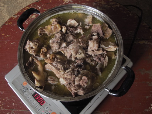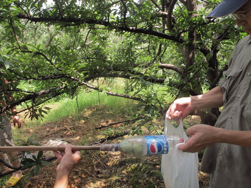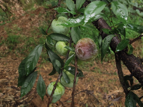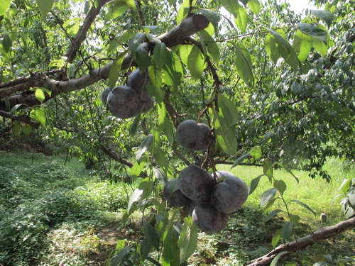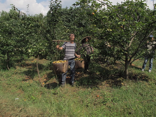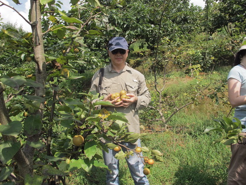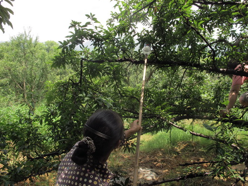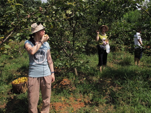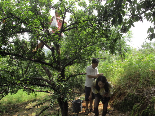 昼ごはんは鶏肉と豚肉をミックスしたお鍋でした。豚も鶏も自家産で、なかなかありがたいもので、普段は食べられません。昼食の後は果物狩りでした。果樹園は唐さんの家の裏から50メートルぐらい離れたところにあります。このころはちょうど李の収穫の季節です。「奈李」(中国の品種)と「黒李」(米国品種)の二種類ありました。地面に李がいっぱい落ちて、勿体無いことでした。自分の手で木から採った果物はやはり自由市場で買ったものより美味しかったです。他に「灌陽雪梨」の梨狩りもしました。「灌陽雪梨」は灌陽県地元の名産物で、中国の各地に出荷しています。しかし、炎天下の夏で、湿気の高い果樹園でフルーツを採る時に汗ビショビショでした。そして果樹園から果物を運ぶこともたいへんでした。つくづくと農家の苦労さが感じられました。