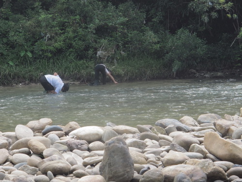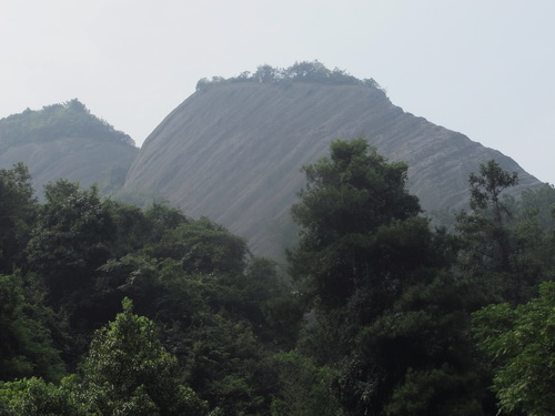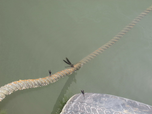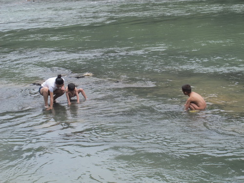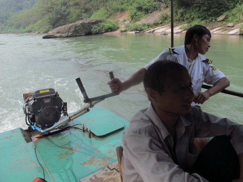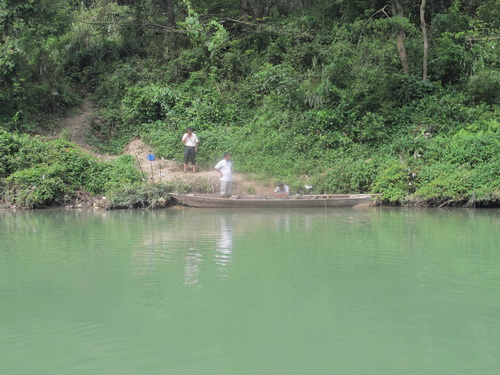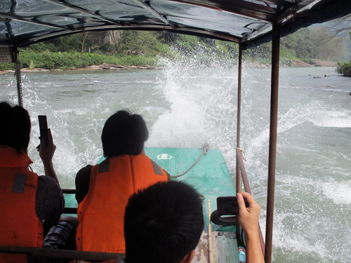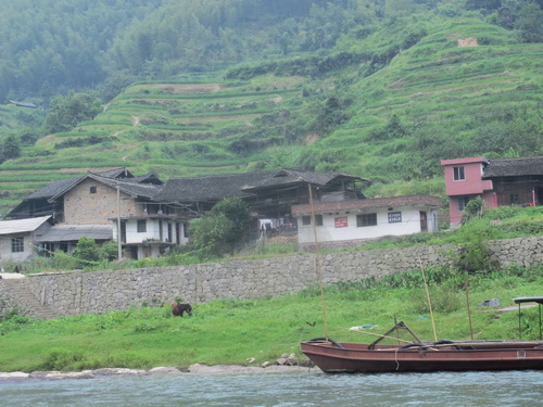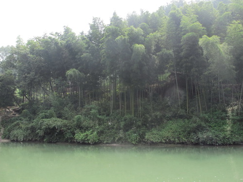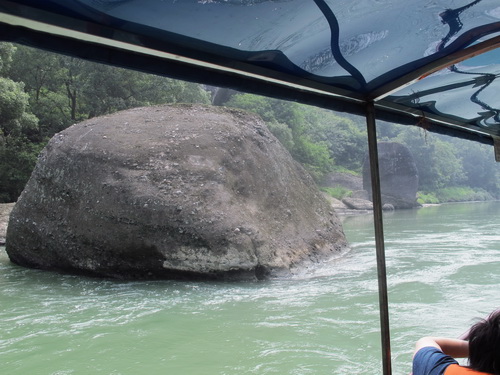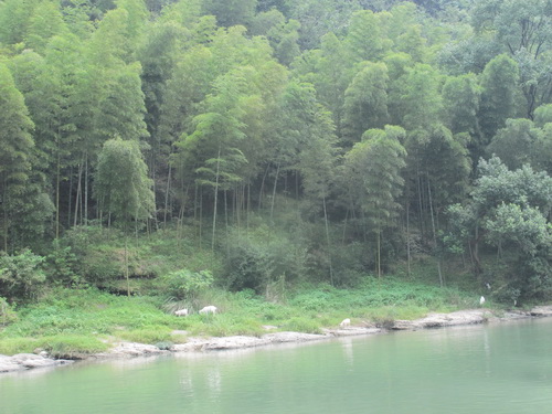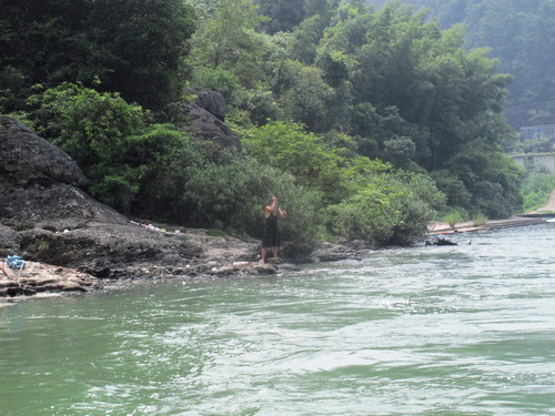 10時40分ごろ、「資江下り」が始まりました。川面は鏡のように穏やかで、両岸の青緑の木々が水面に映っていていて、綺麗でした。静かな水面はスクリューで、一筋の白い波が散りました。珍しいイトトンボがボートに追いかけて、お互いに戯れていました。最高気温は36℃もありましたが、川風が吹いていたので涼しく思いました。途中、たまに、魚釣りと田螺をとる人が見られました。農家の家はあまり見えませんでしたが、放し飼いの山羊、牛、馬と家鴨がいたので、両岸に人が住んでいるでしょう。山山には人工栽培の孟宗竹の竹林がよくありました。灘と川の中にある大きい石を通る時に船はいつも激しく揺れて、波の飛沫が船にかかってきて、楽しかったです。