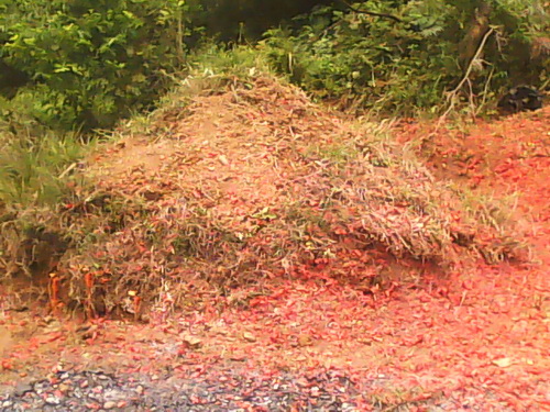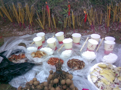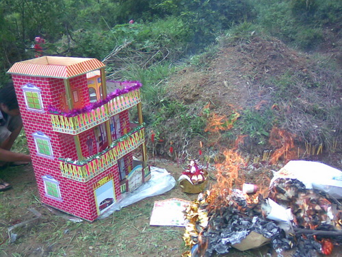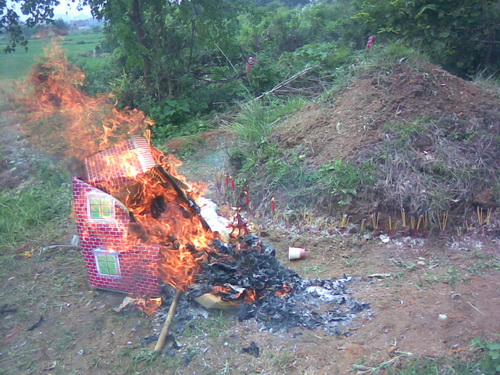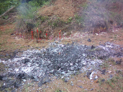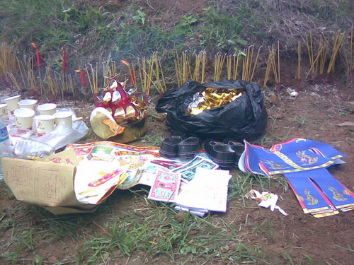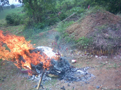 「尾七」の主な行事は墓地の所へ行って祭ることです。「七夕」の日の朝7時から行事の準備が始まりました。墓地は十年ぐらい前に私が爺ちゃんと婆ちゃん及び将来父と母のためにチワン族の村人から土地を買ったのです。今買うならはだいぶ高くなりました。それは私が親に対した一番の親孝行のことでしょう。墓地は「龍山」というの麓にあります。車に30分ぐらい乗り、それから5分間歩くと墓地に着きました。まずお墓の周りの草をとり、それからお墓の上に新しい土を添えて、お墓の形を丸くしました。途中、父の墓から小さいコブラが出てきました。私がそれを殺そうとしたとき、皆に止められました。それは父のお墓を守る「龍」で、ネズミ除けになると言われました。祭る供え物は二種類ありました。一つは食べ物と飲み物でした。それぞれお酒、お茶、フルーツと御馳走などがありました。それは焼かずに、人間はまた食べられます。もう一つは使い物でした。伝統的な物はは紙銭、衣類、靴などがありますが、近年は別荘、車、電気製品、さらに美人の供え物もありました。これらの物は全部で焼くことによって冥界に届けるわけです。そのような行事はなくなった佛のためというよりむしろ生きている人間を慰めるためだといったほうがいいかもしれません。