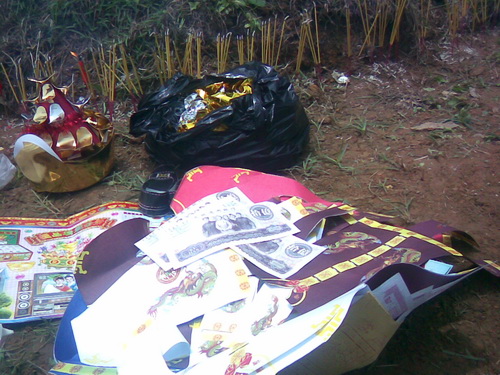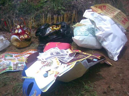 伝統な「金元宝」(金の塊)、紙銭、衣類、靴などの他、人民元ンとアメリカドルも送りました。