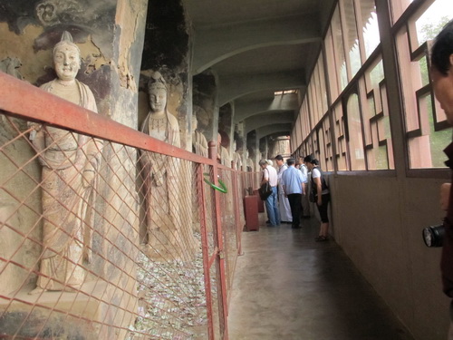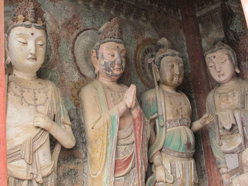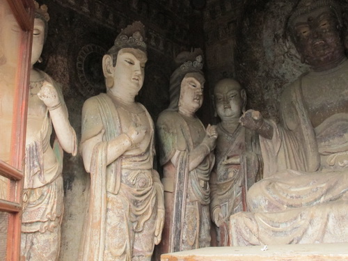 「麦積山」は丹霞地形で、ザラザラの石は細かく刻むことはできないので泥の彫塑で有名になりました。それにほとんどの泥彫塑は色付つられています。