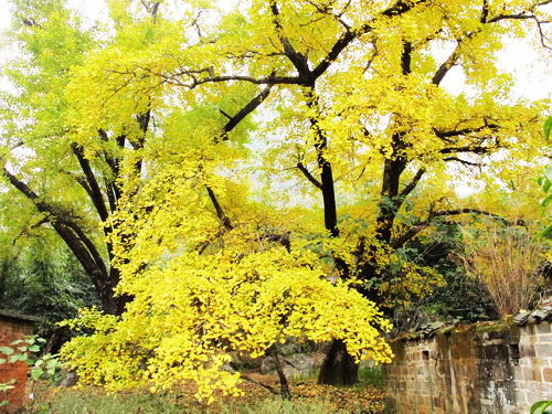 今回のハイキングコースは桂林市からバスで海洋郷へ行って、それから海洋郷から大鏡郷までハイキングするのです。海洋郷は桂林市の東南部にあり、桂林から40キロぐらい離れ、バス一時間ぐらいかかります。海洋郷は海洋山の山群れにあります。数百年前から地元の農家たちは家の周辺の狭い空き地に銀杏の木をいっぱい植えました。ここの土は銀杏の成長にいいでしょうか、海洋郷で産するぎんなんは特別粒が大きくて、朝廷に供える貢物に指定されました。ぎんなんは地元の人の一つの収入になりました.。銀杏の実は中国語は「白果」と言います。銀杏の葉っぱは高血圧、糖尿病、心臓病に効く薬を作る原料です。広東省と広西省の民間には今でも「白果炖老鴨」(ぎんなんと家鴨のスープ)の名料理があります。現在、海洋郷の周囲数十キロの集落、畑と山野の間に百万本ものの銀杏の木が分布しています。栽培の歴史が長かったので、百年以上の樹齢の木だけが1.7万本あり、一番古い木は500年の樹齢もあるそうです。海洋郷は人々に「銀杏の里」と称され、毎年の11月と12月頃には中国の各地からハイキングと撮影のファンが大勢来ます。