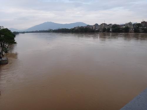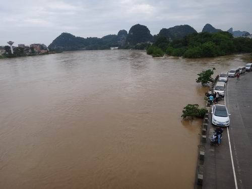冷たい空気と西南からの温かい空気のと衝突により、4月29日から桂林周辺は断続的な大雨が降り始めました。せっかく29日からの三日間の休みなのに、市民がおそらく皆、自宅に閉じ込められて外には出られない状態でしょう。会社の近くにある桂林会展中心で29日から開催された「房•車節」(マンションと車の展覧販売会)は雨の影響で訪れた人があまり多くなかったということです。特に30日の朝3時ごろから2時間にわたる集中豪雨に見舞われたので、ただでさえ水が溢れた離江は更に水位が上がり、警戒水位とされる146Mまで、わずか0、1センチの差の145、9Mの厳しい水位になってしまいました。ありがたいことに翌日の離江の川下りが平日どおり出港できました。ただ川面の筏遊覧コースが安全のため禁止されたということです。