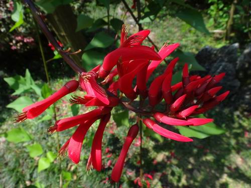 筆者がこの間、桂林新聞を見て虞山公園の中に珍しいカポック(木綿とも言います)の木に花が満開したということがわかり、昨日虞山公園に出かけることにしました。しかし残念なことに行ってみたら殆ど花が萎んで落ちました。思わず「花が我を待たず」という古い言葉が思い出され、空しい思いがしました。少しがっかりした気持ちですが、ふと側に「象牙紅」という真っ赤な花が満開しているのが見えて慰めてくれました。よく見れば「象牙紅」は桂林の炎天下の暑さを介せずしょげる気配もなく元気に咲いています。報道によると「象牙紅」(龍牙花とも言い、日本語でデイコ、エリスリナということでしょうか)は原産地が南ラテェーアメリカであり昔、大変珍しい観賞用の植物として親しまれていたそうです。落葉樹の一種に属していますが数年前に桂林に導入されました。しかし桂林の風土に見事に慣れて元気よく成長していると評判されています。すでに空港に行く道路や西山公園、訾洲公園、園林植物園などに植えられています。「象牙紅」は花が真っ赤で人々の人気を集めるだけではなく開花の期間も長くて5月から10月まで続くそうです。この「象牙紅」の「大サービス」により、少しずつ真夏の桂林の一つの見どころになればと期待しています。