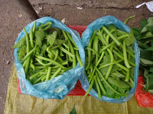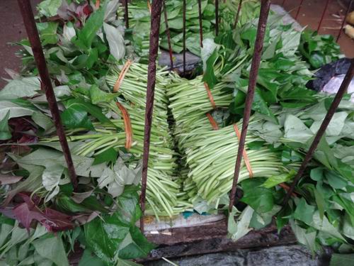 自由市場で新鮮なサツマイモの蔓も売られています