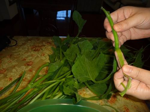 具体的な手順はまだ薹(とう)が立っていないうちの蔓を千切っており、それから丁寧に蔓の皮や堅い部分を剥きます。中の柔らかい部分をそれぞれ2、3センチほどの長さに切ります。きれいに洗ったあと、それをただ油と大蒜で炒めれば美味しい炒め料理一品になります。食べると違和感があるどころか口触りがかりかりとして食べやすいです。お医者さんの話によるとカボチャの蔓は繊維が多く含まれているからコレステロールの引き下げに効くということです。それに炒めるだけではなく、スープや徒花の豆腐詰めなども気軽に作ることができます。