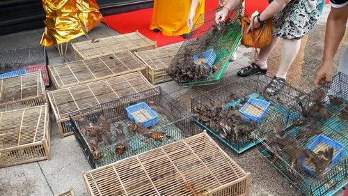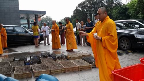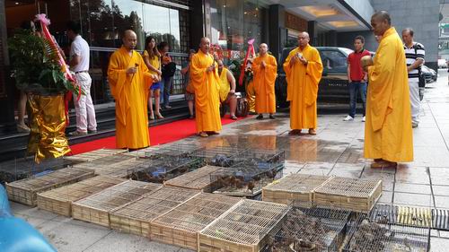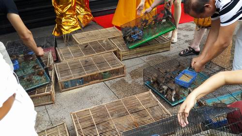 「放生」の時刻が朝9時半に予定し、その前に近くにある寺院の何人かの僧侶が来るように頼んだらしかったです。仏教の習わしによると「放生」とされる魚と小鳥が僧侶の唱えたお経を聞いてからこそ、そのご利益を示してくれると言います。そこで僧侶たちは15分ほど泥鰌と小鳥の入った籠の傍に立ち、荘厳な雰囲気の中で「放生」のお経を唱えていました。お経が終わると傍に待っていた信者たちが鉄の籠の扉を開け、次々に丁寧に小鳥が空に飛び立つようにしました。中に人間におじけて迷ったりうまく出られなかったりした小鳥もいましたが、どうにか皆空に飛び立つのに成功しました。